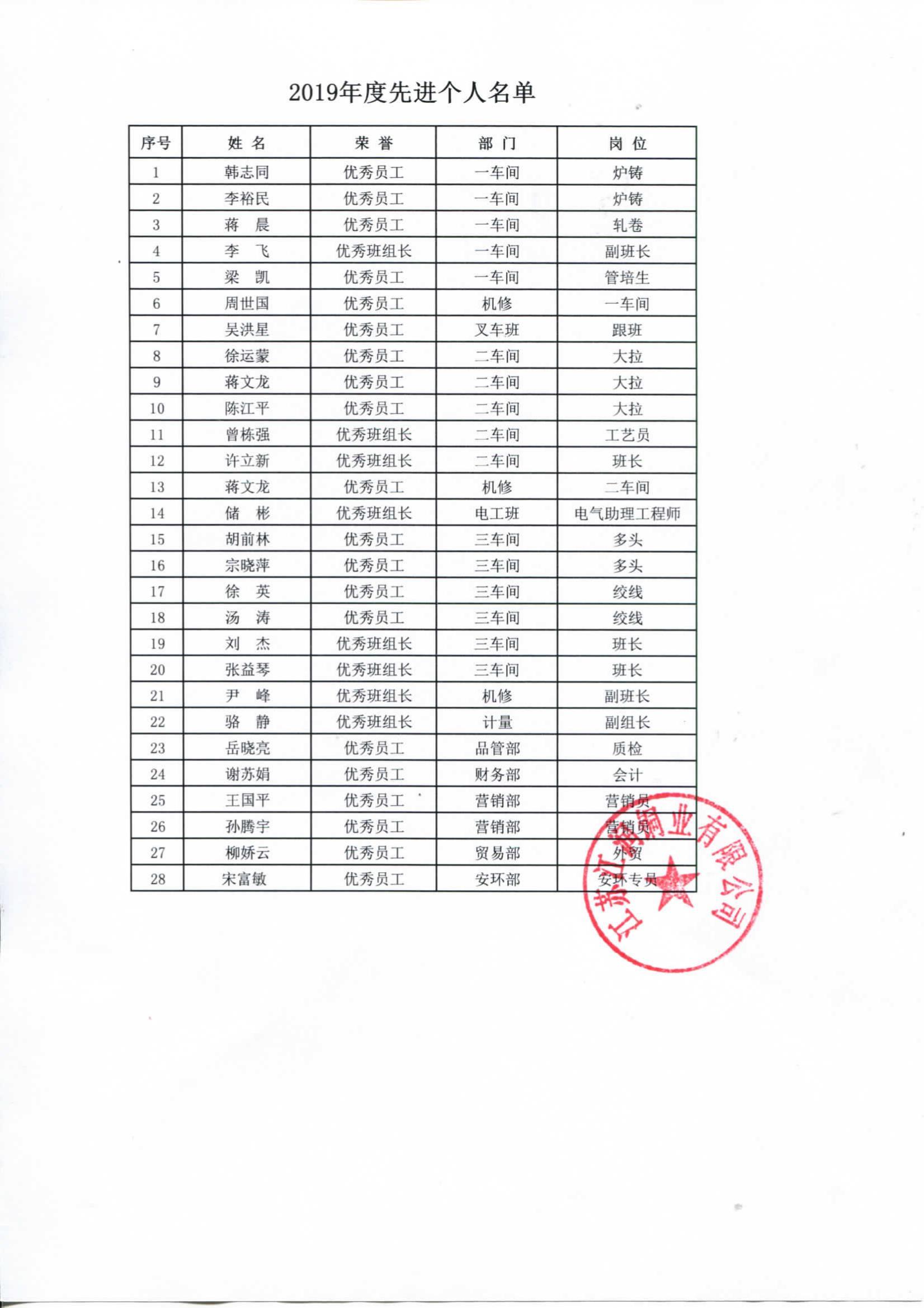 2019年度江润铜业先进表彰